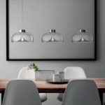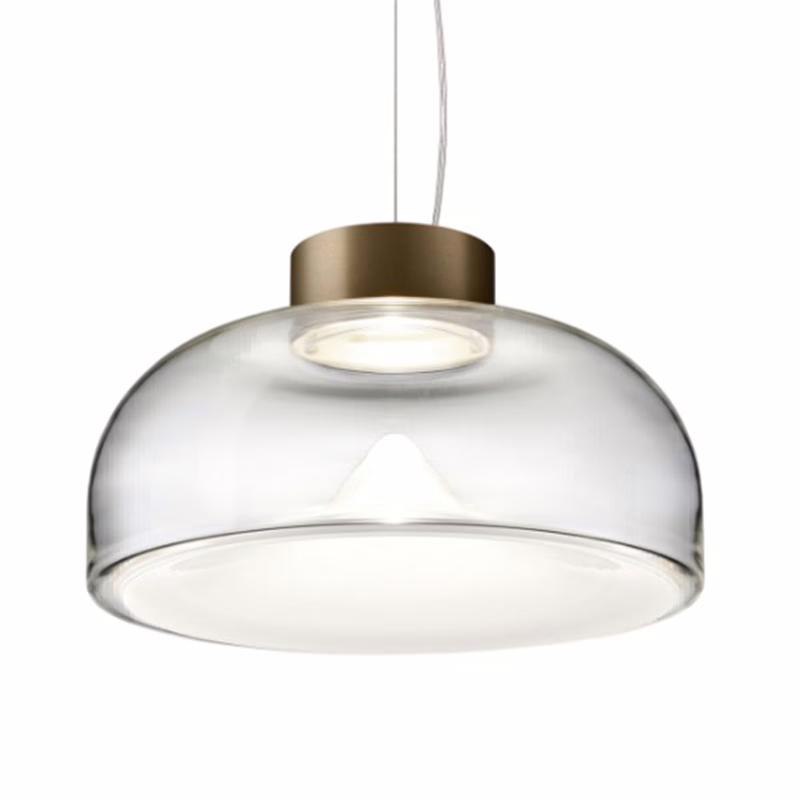 Aella is the ‘whirlwind’, embodied by the dynamic movement captured in its handblown glass diffuser. Emanating from the single point, an evanescent light cone grows to create sinuous patterns and harmonic reflections. Designed in 1968 by Toso and Massari, this table and suspension lamps collection incorporates the essential and timeless design principles, characteristic of Leucos’ products. Available in two sizes for the table and suspension versions (Ø30 and Ø54 cm – Ø11 3/4” and Ø21 1/4”) with transparent or smoked glass diffuser. Structure in 4 finishes for the Ø54 cm version (glossy chrome, glossy warm white, vintage brass, matt gunmetal) and 3 finishes for the Ø30 cm version (glossy chrome, glossy warm white and glossy gunmetal) with matching canopy in the same color for the pendant version. The LED light source (Aella S 54 e Aella T 54) can be easily replaced by the user.
