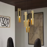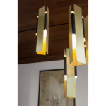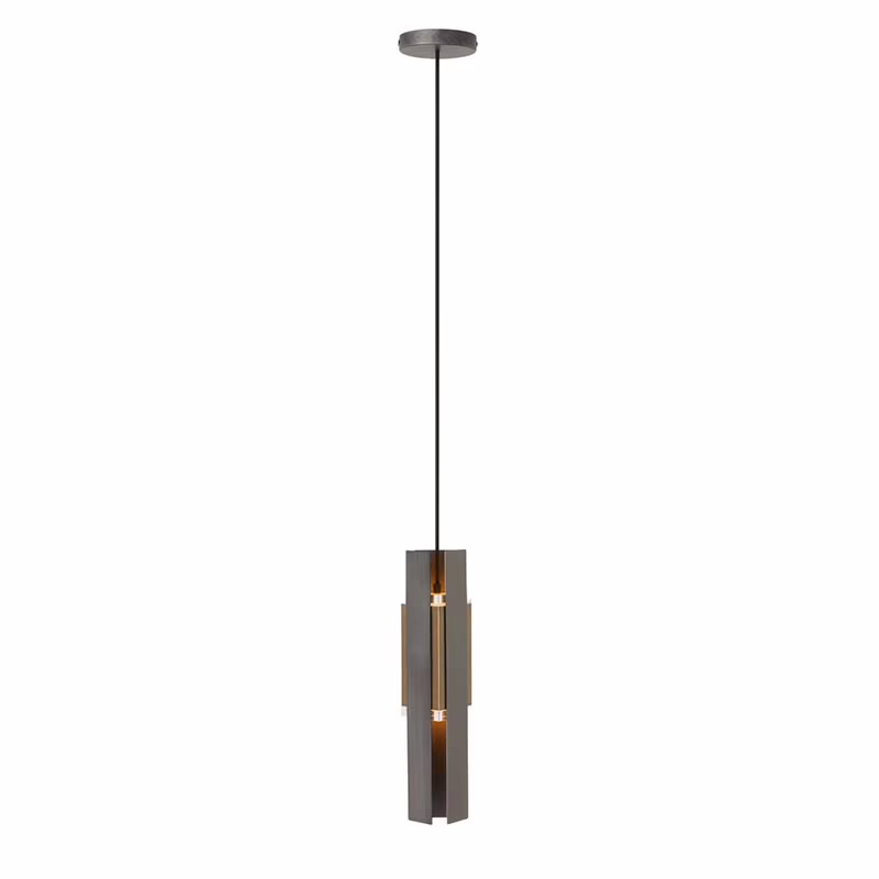 A lamp with subtle Deco inspiration, featuring a black-coated body and two plexiglass prisms that diffuse the light, wrapped in three brushed metal foils. In addition to the classic brushed brass finish, the collection is now also available in satin bronze and satin titanium, offering new interpretations of its elegant geometry. Excalibur comes in multiple configurations: single or clustered suspensions, two sizes of chandelier, and wall versions in single or double format.