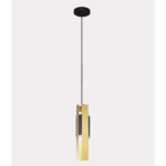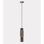 A lamp with subtle Deco inspiration, featuring a black-coated body and two plexiglass prisms that diffuse the light, wrapped in three brushed metal foils.