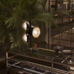 Collection of neo-vintage metal lamps with a double-sided diffuser in borosilicate glass. The metal domes (one internal and the other one external) have the internal side with different colors or finishing: they can be painted or finished in polished brass and bright copper, thus to create different textural combinations. The collection presents hanging lamps, floor lamp, table lamp, wall and ceiling. The hanging and wall lamp version are provided with a further G9 source located in the lower part of the lamp.