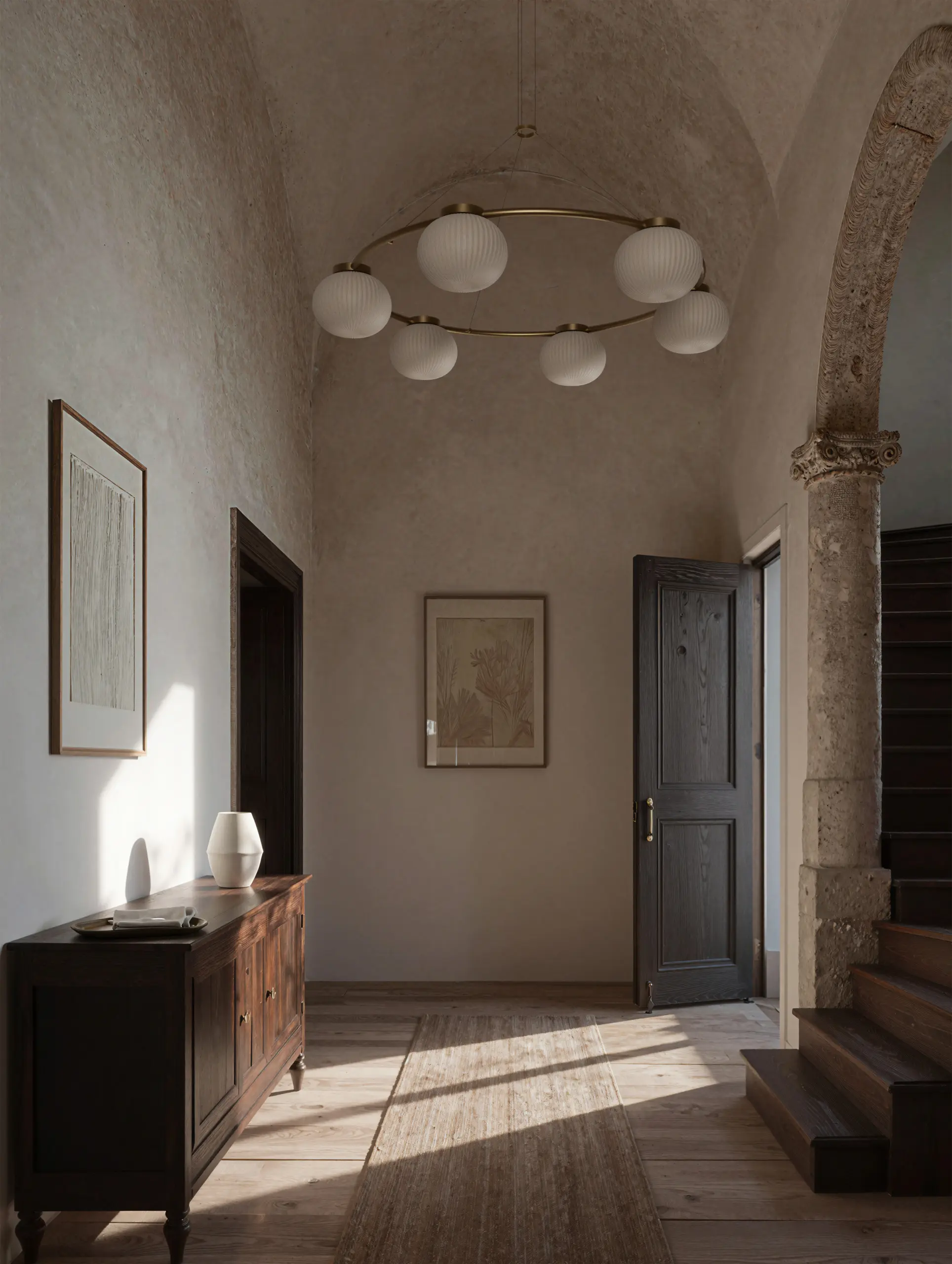 As the central element of the collection, the IRZO 6-Light Chandelier reinterprets the classic chandelier language through a contemporary, sophisticated aesthetic. By arranging six spherical opal shades across a structured metal frame, this piece creates a balanced dialogue between light and space. The opal glass serves as a natural diffuser, ensuring that even with six light sources, the output remains soft and pleasant. This fixture is designed for those who want to command attention in a dining room or hotel lobby while maintaining a sense of serenity and visual lightness.