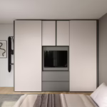 At the heart of the design is a dedicated TV mount, seamlessly integrated into the central section. This allows you to enjoy a streamlined “media wall” effect, keeping your room tidy and free from bulky external stands—a signature feature of our luxury fitted wardrobes.
